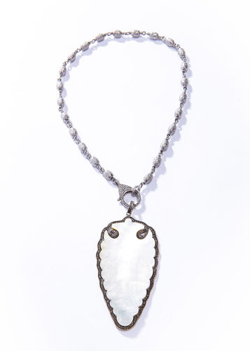 Diamond Encrusted Mother of Pearl Arrowhead Pendant w/Diamond Cut Sterling Silver Rosary Chain & Clasp #1070