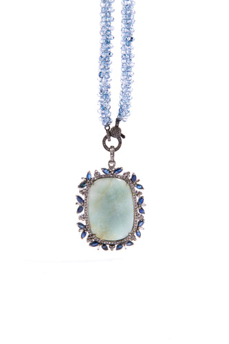 Moss Aquamarine (24c), Sapphire(12.09c) & Diamond (.87c) Pendant in Sterling on Woven Mystic Topaz Rope w/ Diamond Lobster Claw Clasp Necklace (30"+2.5") #9488