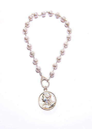Rhodium Plated Hand Hammered Sterling Beads w/ Diamond Baguette,Single Cut Pave Sterling Beads & Blackened Hand Hammered Sterling Chain(30") #9157