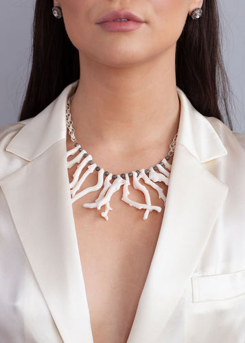 Natural White Coral & Diamond Pave Beads w/ Textured Sterling Chain & Diamond Lobster Claw Clasp (21") #9154